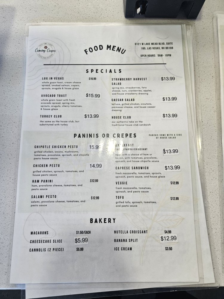 Introducing Craving Crepes, a delightful breakfast and brunch spot nestled in Las Vegas. Known for its warm atmosphere and charming decor, this eatery specializes in a diverse selection of crepes that cater to both sweet and savory cravings. Whether you're yearning for the indulgent Ferrero Crepe, bursting with hazelnut goodness, or the flavorful Chicken Pesto Crepe, each dish is crafted with care and freshness.